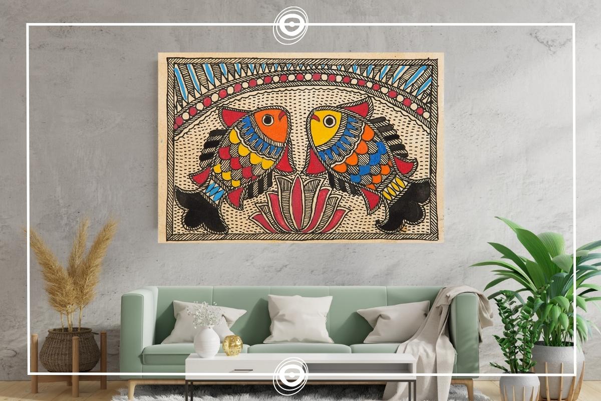 Madhubani paintings are characterized by figures that have prominently outlined, bulging fish-like eyes and pointed noses. The themes of these paintings usually include natural elements like fish, parrot, elephant, turtle, sun, moon, bamboo tree, and lotus.